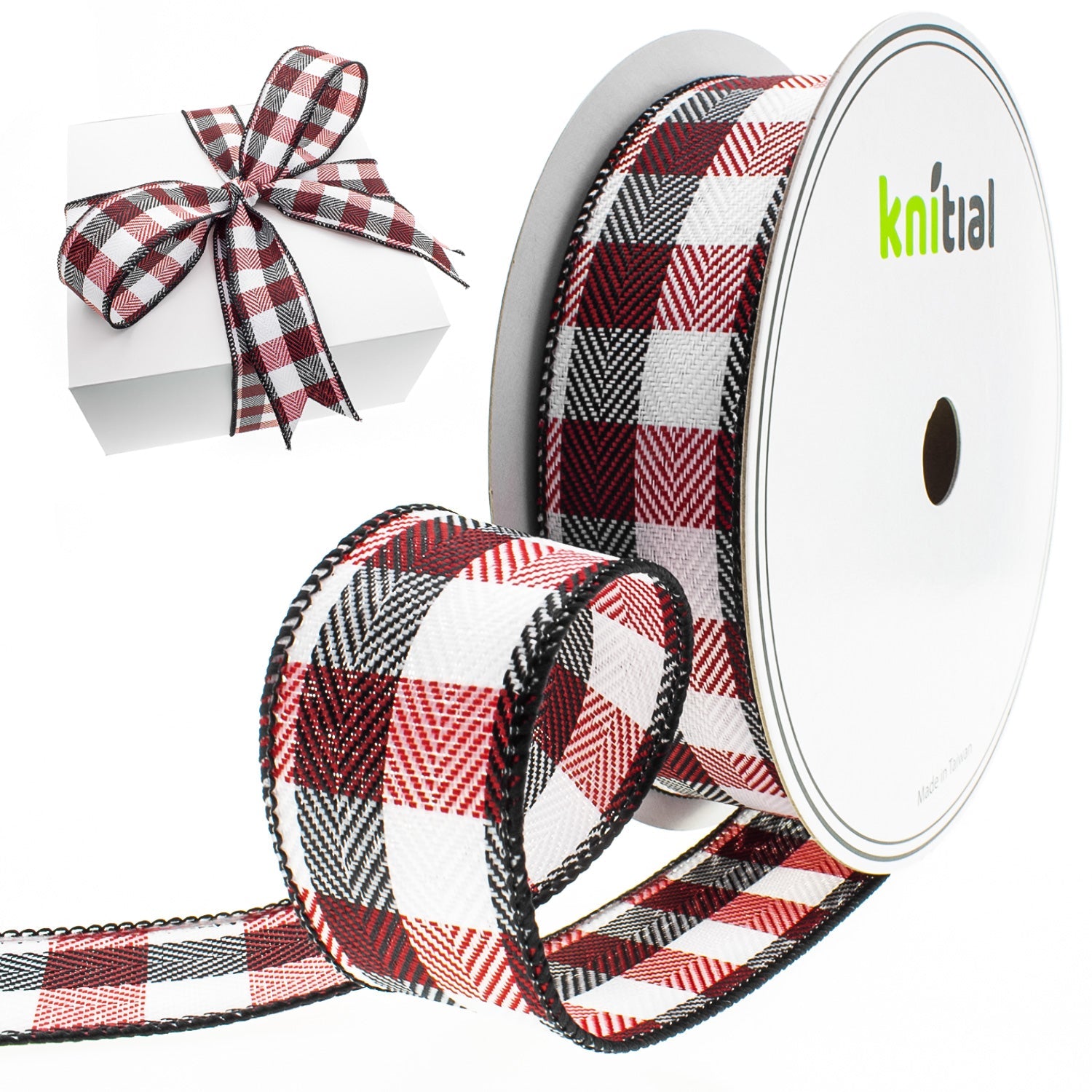 Details about our Knitial branded wired buffalo plaid black and red, black and white ribbon
